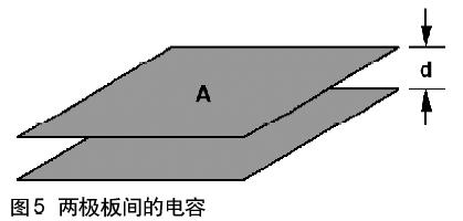 當尋找有問(wèn)題的寄生源時(shí),可能用得著(zhù)幾個(gè)計算上述那些寄生電容尺寸的基本公式。公式(1)是計算平行極板電容器(見(jiàn)圖5)的公式。