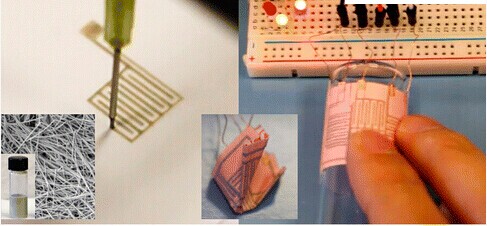 研究人員開(kāi)發(fā)了一個(gè)打印系統,能到在短短幾分鐘內把一個(gè)銀質(zhì)墨水圖案打印到紙上,然后用照相機閃光燈照射使其變硬。即使被彎曲,被反復折疊展開(kāi)15次,被反復卷曲鋪開(kāi)5,000次,打印出來(lái)的傳感器還是可以對碰觸作出回應。該團隊后得出結論,他們打印的既耐用又輕微的傳感器可以應用于很多應用軟件上。