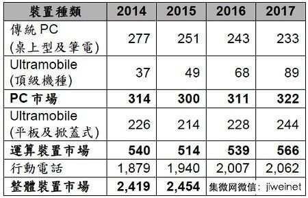 2015年ultramobile市場(chǎng)(平板及掀蓋式)也將呈現萎縮局面。據估2015年ultramobile出貨量將達到2.14億臺,較前一年下滑5.3%。其中,2.07億臺為平板設備,較2014年下滑5.9%。