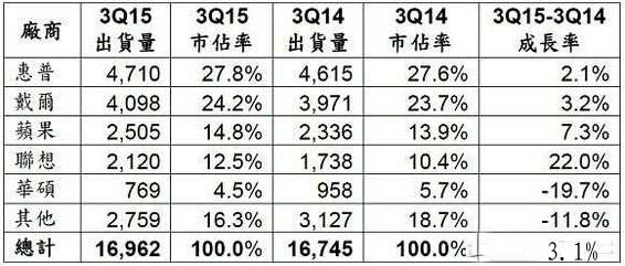 (來(lái)源:Gartner,2015年10月;備注:以上數據包含桌上型PC、筆記型PC與頂級ultramobile機種。所有資料均根據初步調查結果所推估,后推估值可能有所變動(dòng)。本統計數據以銷(xiāo)售到通路的出貨量為準。因采自舍五入,個(gè)別數字加總可能有別于總計數量。)