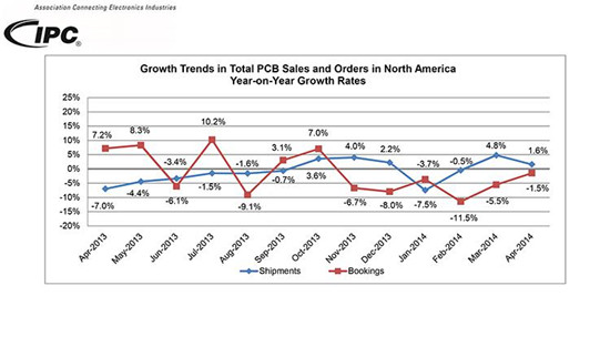 2014年4月份北美地區PCB總出貨量,同比增長(cháng)1.6%,把年初至今的出貨量推高至-0.2%。與上月相比,PCB出貨量環(huán)比下降12.0%。