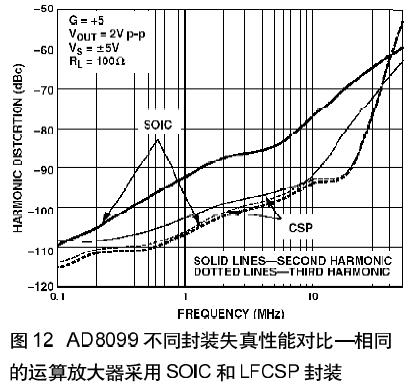 這種引腳排列還有一個(gè)好處就是降低了二次諧波失真。傳統運算放大器的引腳配置中引起二次諧波失真的一個(gè)原因是同相輸入和負電源引腳之間的耦合作用。LFCSP封裝的低失真引腳排列消除了這種耦合所以極大地降低了二次諧波失真;在有些情況下多可降低14 dB。圖12示出了AD80992 采用SOIC封裝和LFCSP封裝失真性能的差別。