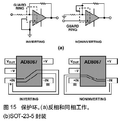 保護環(huán),或者說(shuō)“隔離環(huán)”,是運算放大器常用的另一種屏蔽方法,它用于防止寄生電流進(jìn)入敏感結點(diǎn)。其基本原理很簡(jiǎn)單――用一條保護導線(xiàn)將敏感結點(diǎn)完全包圍起來(lái),導線(xiàn)保持或者迫使它保持(低阻抗)與敏感結點(diǎn)相同的電勢,因此使吸收的寄生電流遠離了敏感結點(diǎn)。圖15(a)示出了用于運算放大器反相配置和同相配置中的保護環(huán)的原理圖。圖15(b)示出用于SOT-23-5封裝中兩種保護環(huán)的典型布線(xiàn)方法。