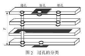 通孔,這種孔穿過(guò)整個(gè)線(xiàn)路板,可用于實(shí)現內部互連或作為元件的安裝定位孔。由于通孔在工藝上更易于實(shí)現,成本較低,所以一般印制電路板均使用通孔。過(guò)孔的分類(lèi)如圖2 所示。