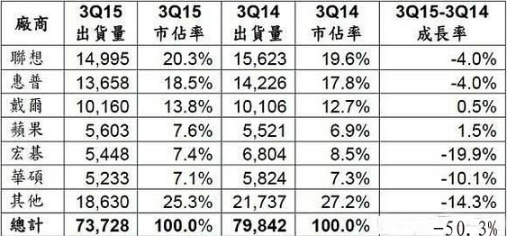 (來(lái)源:Gartner,2015年10月;備注:以上數據包含桌上型PC、筆記型PC與頂級ultramobile機種。所有資料均根據初步調查結果所推估,后推估值可能有所變動(dòng)。本統計數據以銷(xiāo)售到通路的出貨量為準。因采自舍五入,個(gè)別數字加總可能有別于總計數量。)