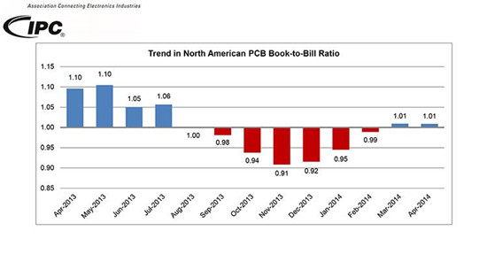 2014年4月份北美地區PCB總出貨量,同比增長(cháng)1.6%,把年初至今的出貨量推高至-0.2%。與上月相比,PCB出貨量環(huán)比下降12.0%。